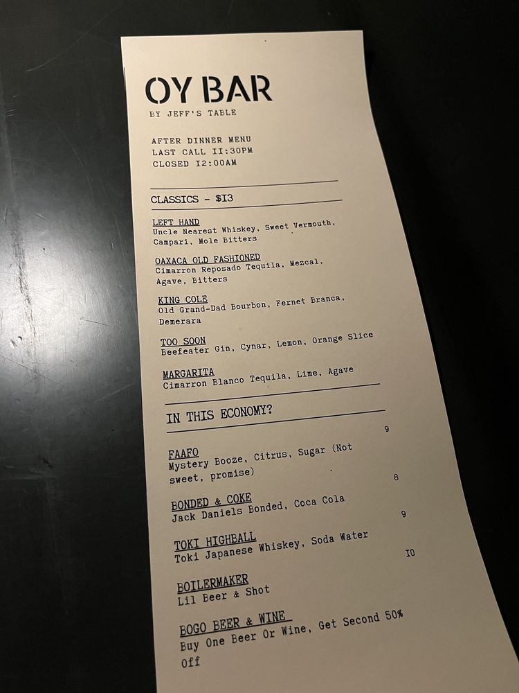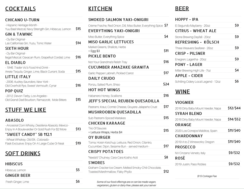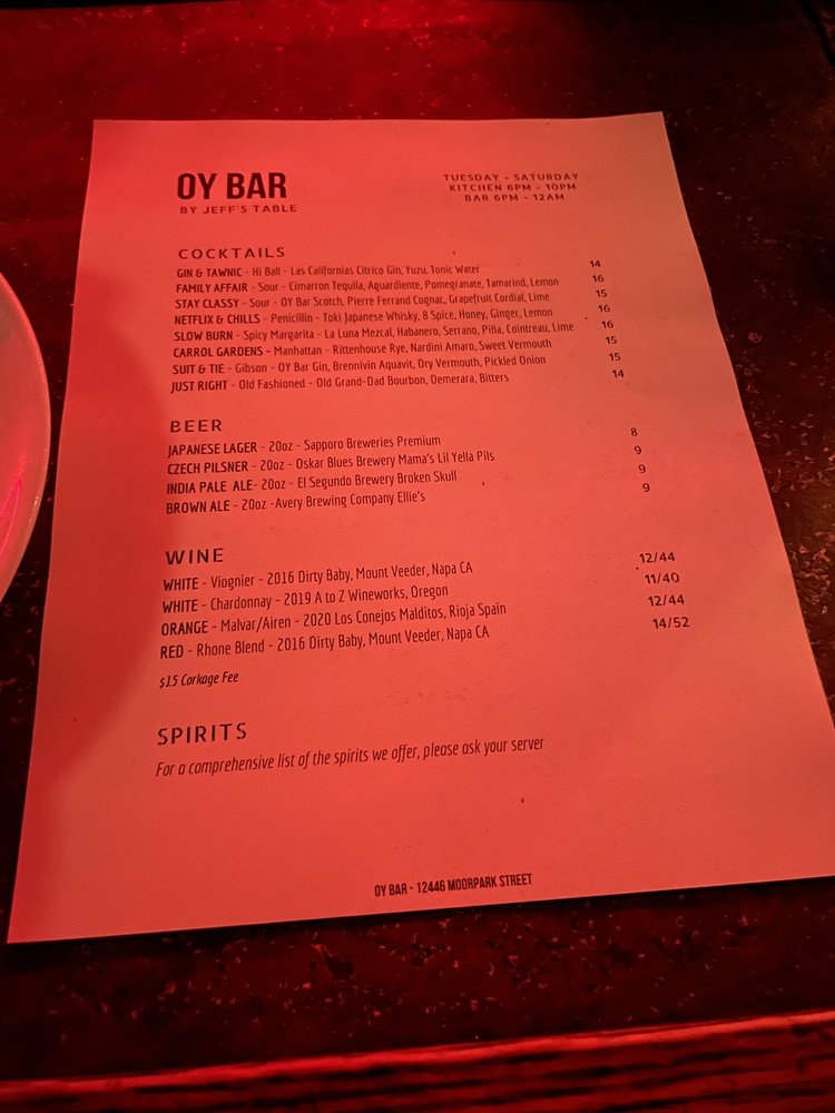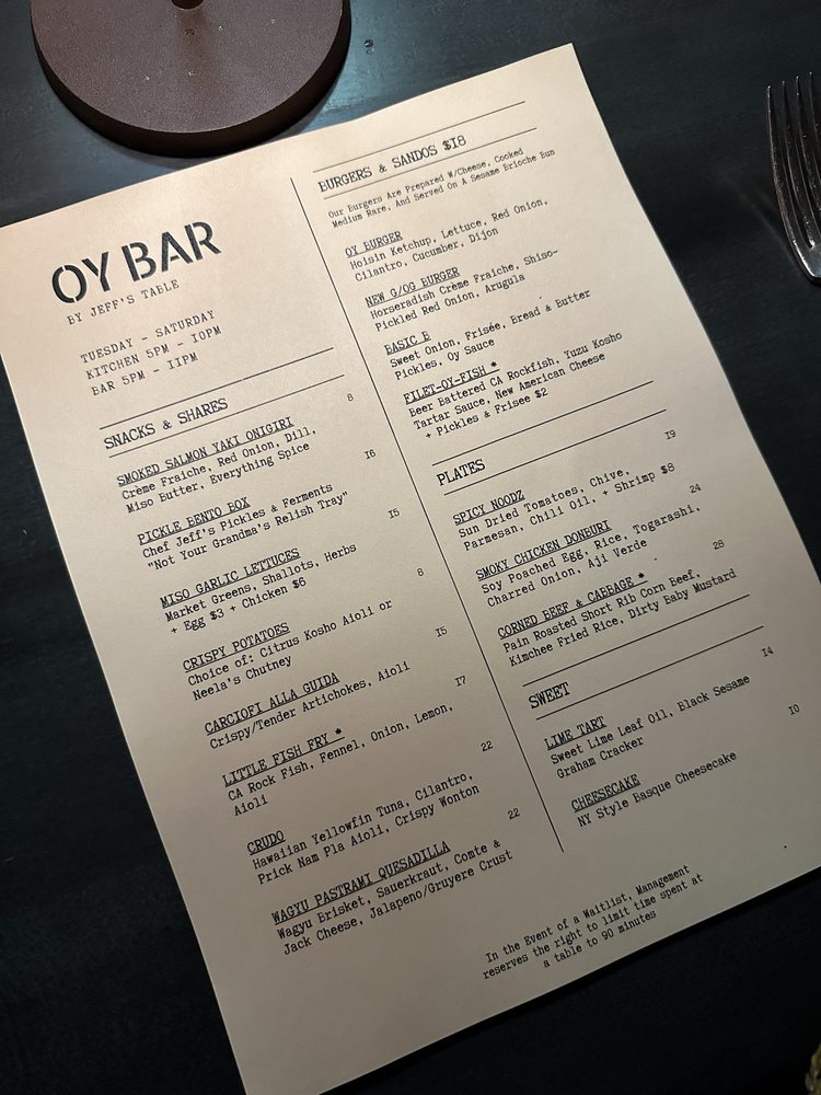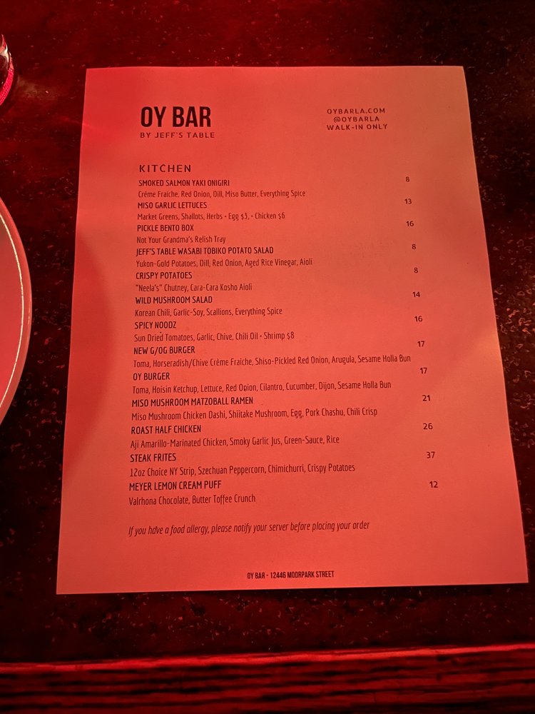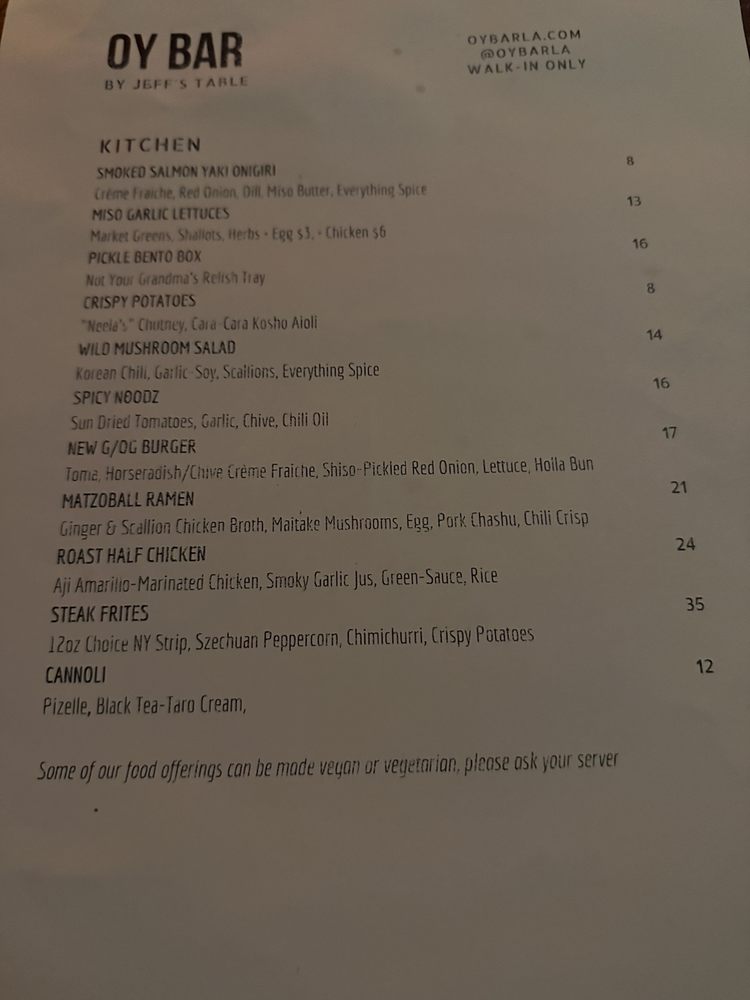 OyBar is a cocktail bar in Studio City, CA that offers a unique fusion of Japanese and Jewish inspired dishes. With a divey, hipster vibe and intimate ambience, it's the perfect spot for a date night or catching up with friends. Customers rave about the Hainanese style chicken and rice, everything bagel sushi, and smoked salmon bites. The menu features signature cocktails and a mix of sharing plates and main dishes, such as the everything-bagel inspired salmon onigiri and Wagyu quesadilla. The attentive staff, excellent cocktails, and delicious food make OyBar a must-visit for those looking for a cool and unique dining experience. Make sure to arrive early as they don't take reservations and the space fills up quickly. OyBar truly stands out as a gem in Studio City's dining scene.